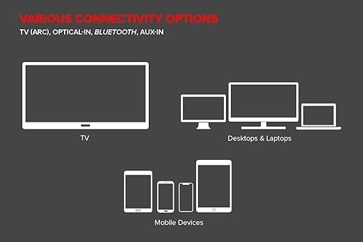 - Various connectivity options: conveniently connect your TV, pc or mac, and mobile phones through our myriad of connectivity options such as wireless Bluetooth, 3.5mm aux-in, optical audio input, TV (arc) and USB MP3