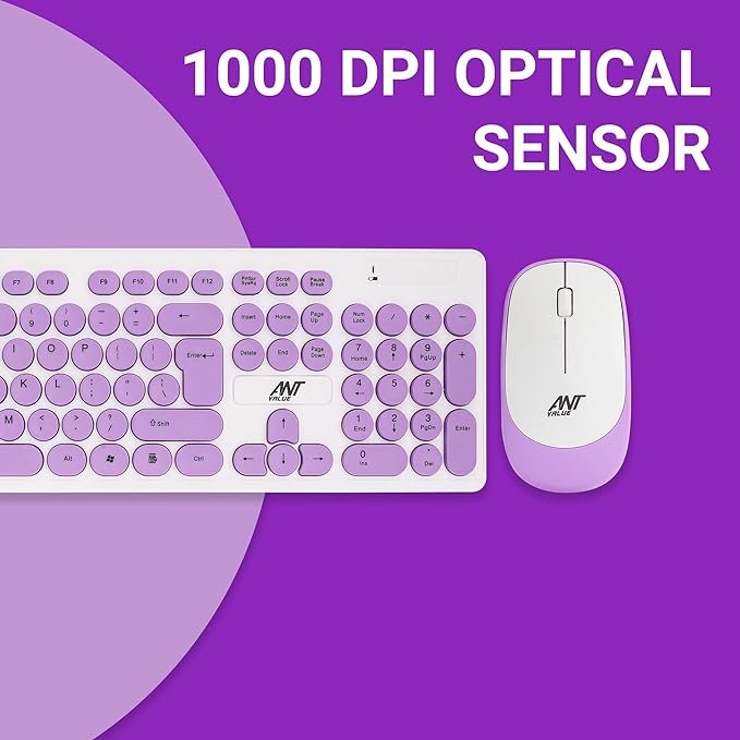 Ant Value FKBRI05 Wireless Keyboard Mouse Combo - 2.4Ghz Aesthetic Quiet Keyboard and Mouse - 110 Keys Full Size Ultra-Thin Keyboard for Laptop, Computer, PC, Notebook, Windows, Mac OS (Purple white)