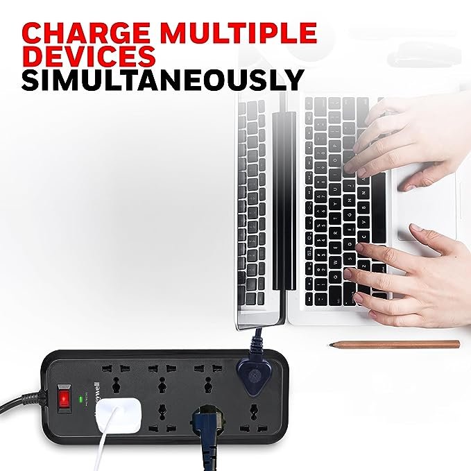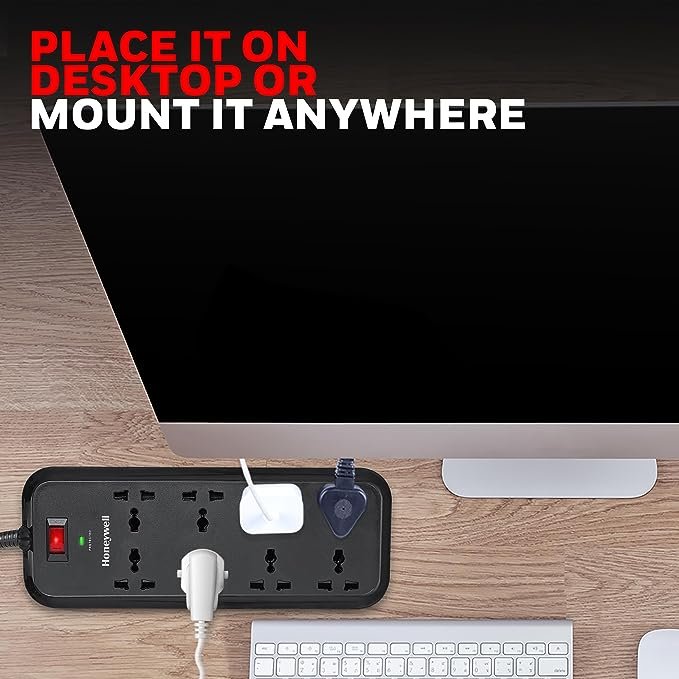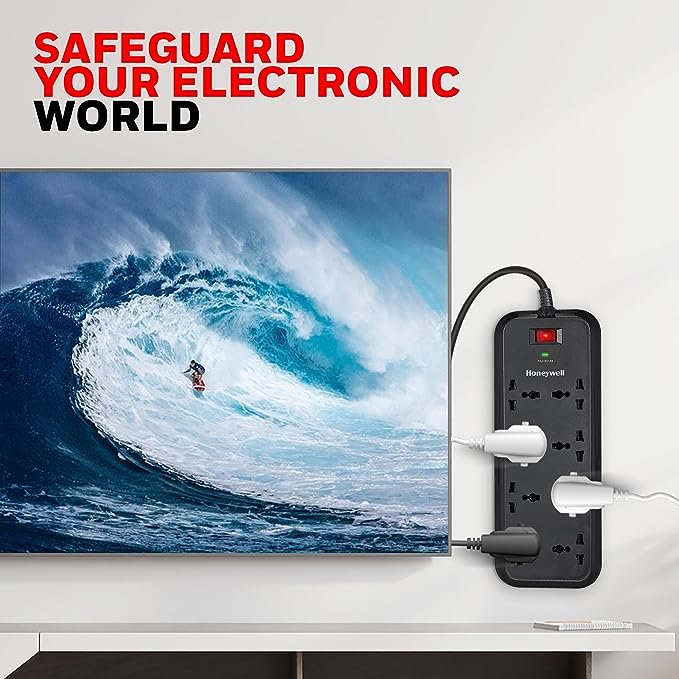 Honeywell Surge Protector, 8 Universal Sockets, 2 Meter Cord, 20000Amp, Device Secure Warranty,Automatic Overload Protection,Spike Guard/Extension board,Master Switch ( Black ) (UNBOXED)
