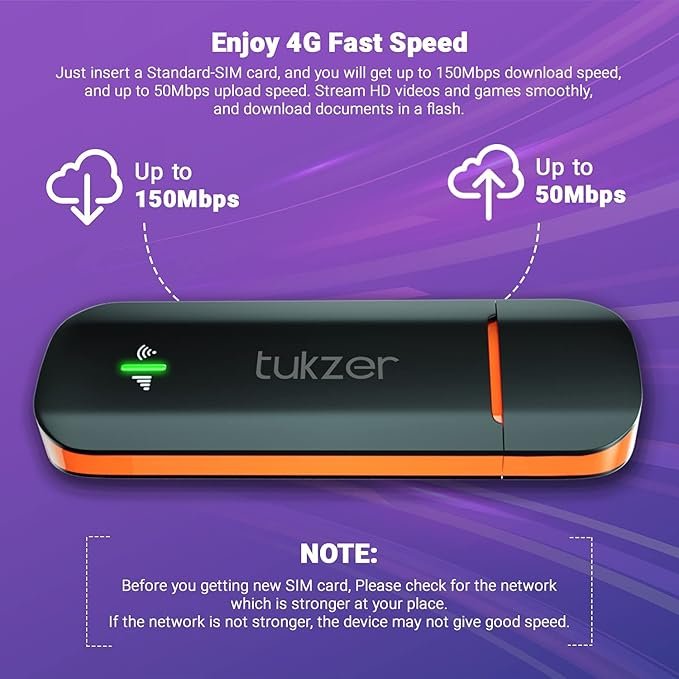 Tukzer 4G LTE Wireless USB Dongle Stick with All SIM Network Support | Plug & Play Data Card with up to 150Mbps Data Speed | SIM Adapter Included (Black) (UNBOXED)
