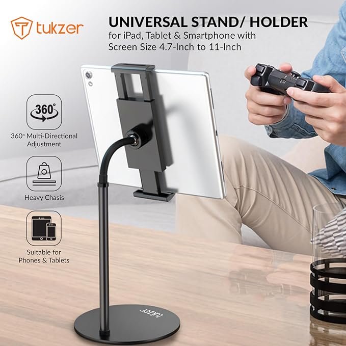 Tukzer Professional Desktop Tablet Stand Mobile Holder with Flexible Arm, 360° Swivel & Height Adjustament| Anti-Skid Sturdy & Heavy Metal Base for 4.7 to 11-Inch Tablet, iPad & Smartphone (Black) (UNBOXED)