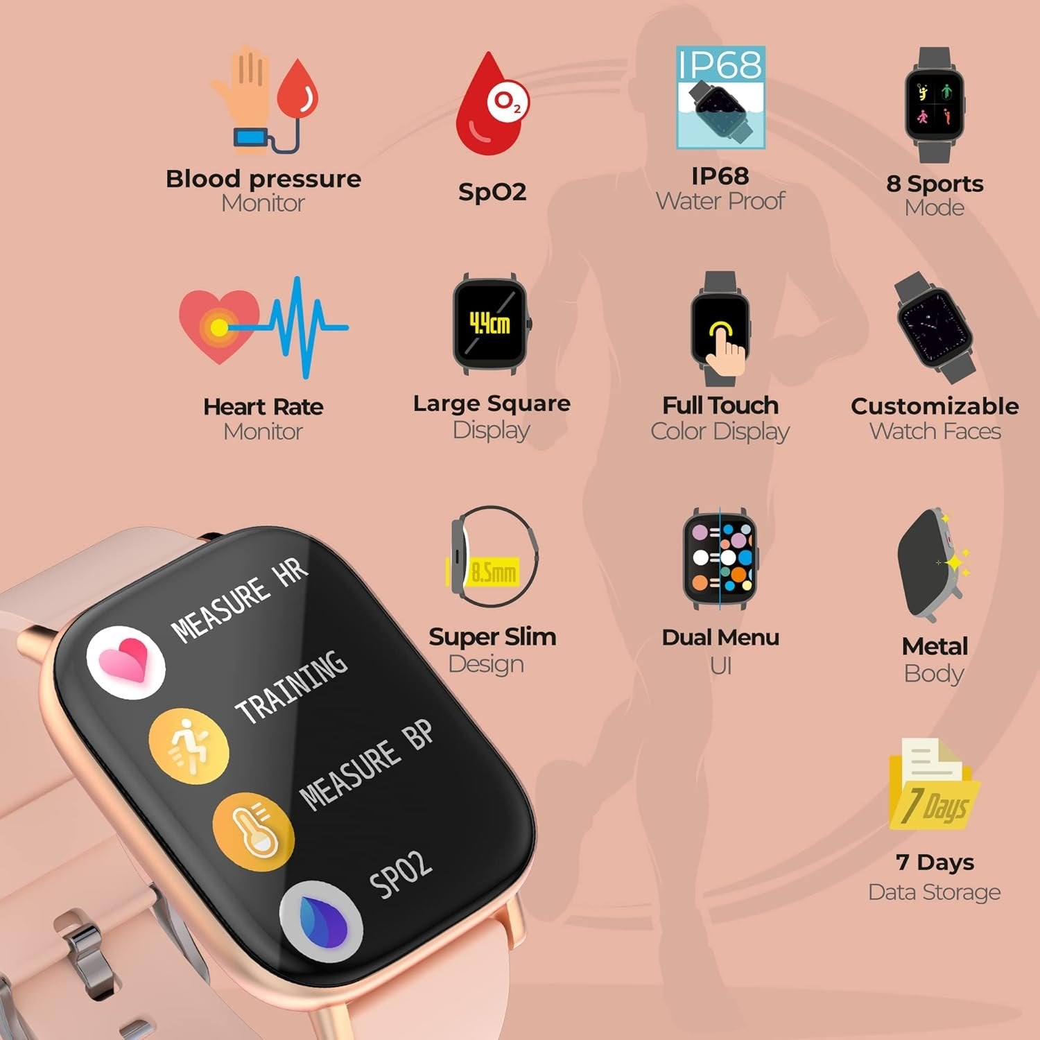 - Track: Sleep, Steps, Calories, Distance;100+ Customisable Watch Faces; IP68 Water Resistant;Features like: Water Reminder, Stopwatch, Weather Forecast, Caller ID, Call Reject, SMS & App Notifications.